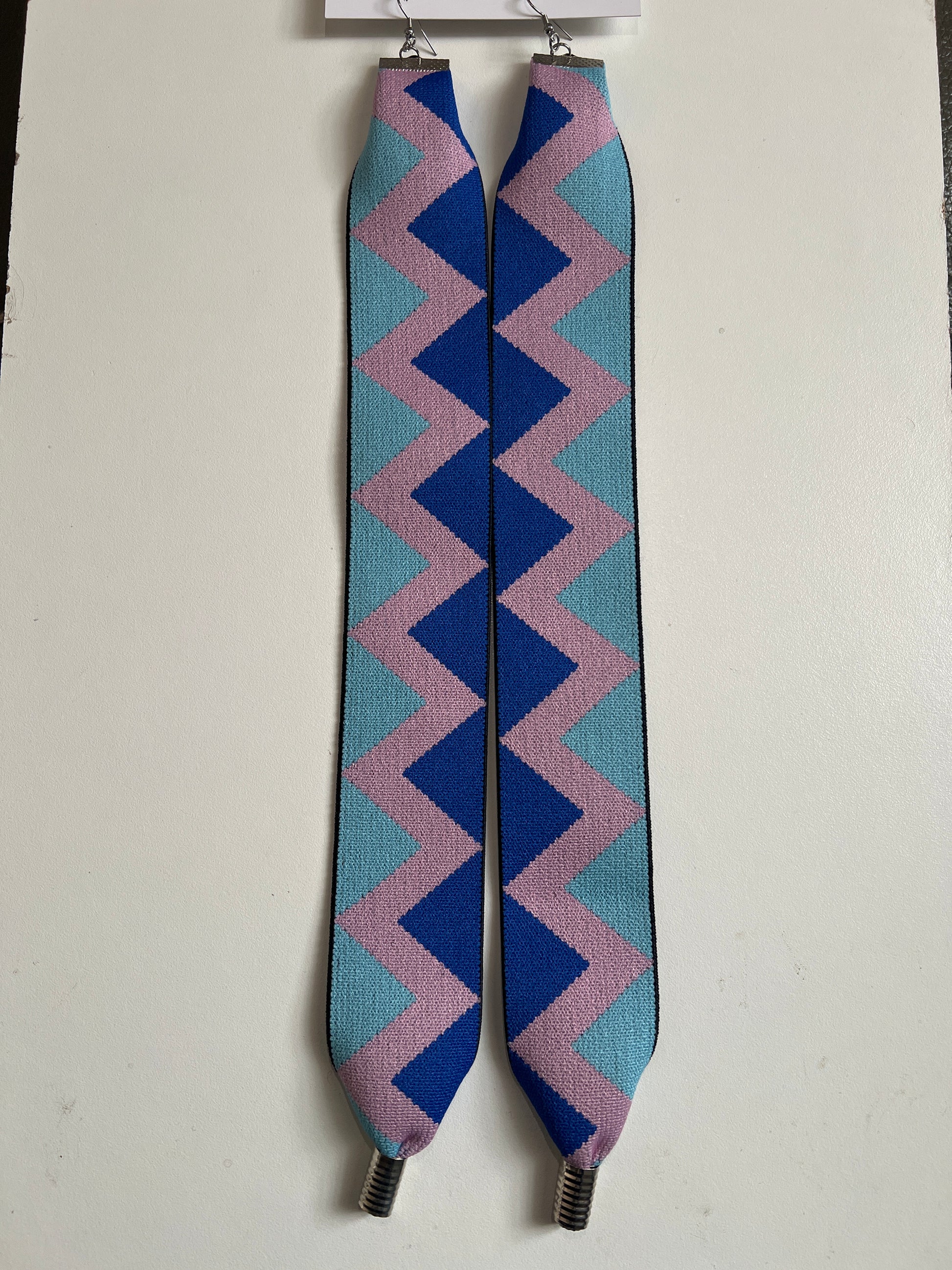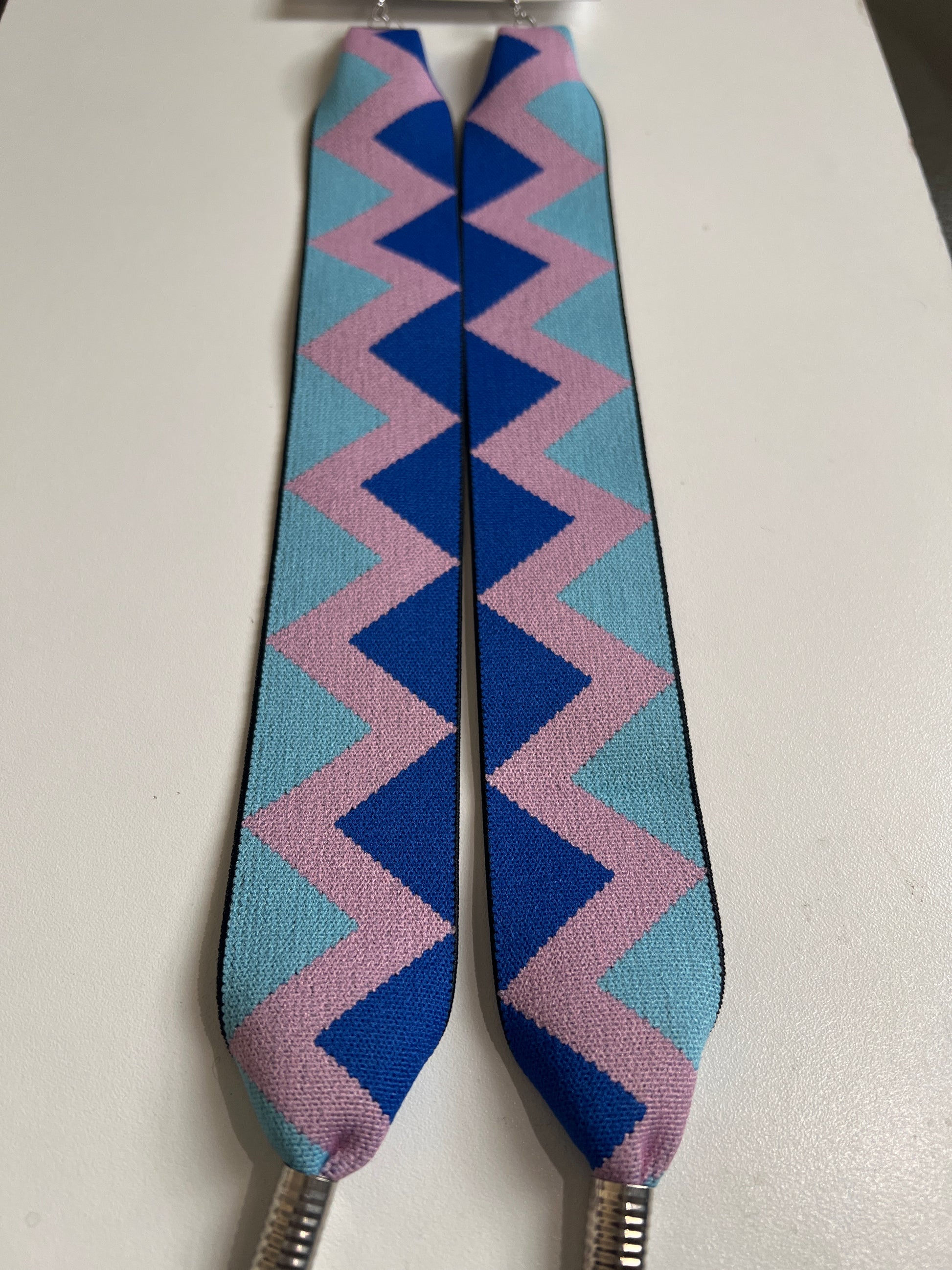 The zig-zag pattern in calming blue, teal, and soft mauve adds a playful but stylish look. The length creates a beautiful vertical line that makes your face and outfit stand out instantly.
